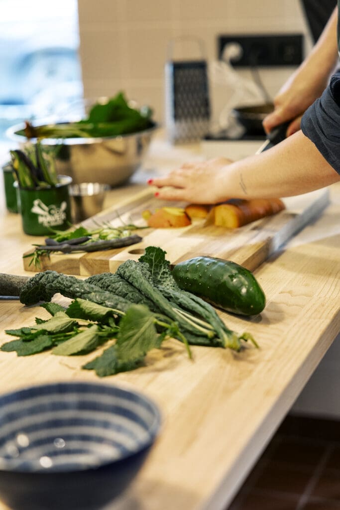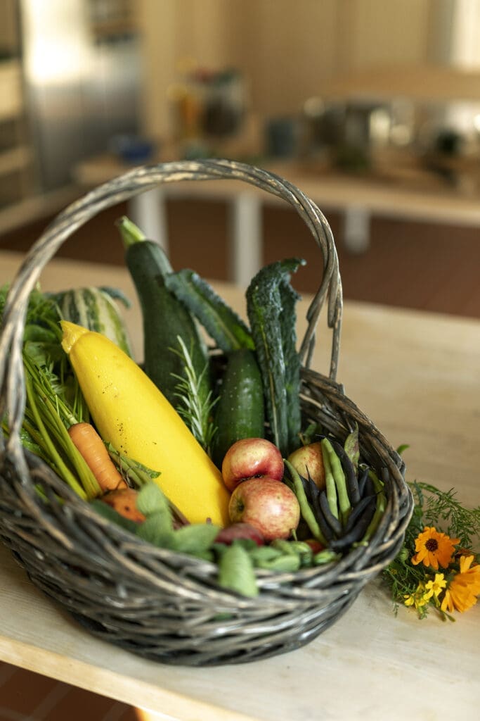 Det er som udgangspunkt et grønt køkken, så eventuelt fisk eller kød skal tilberedes udendørs i vores udekøkken, hvor der er en stor gasgrill til rådighed.
