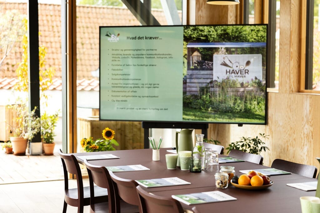 Vores smukke mødelokale er et lyst og fleksibelt rum, der egner sig til alt fra møder og workshops til oplæg og kreative aktiviteter. Rummet kan tilpasses dit behov – uanset om I er få eller mange – og der er både adgang til terrasse, et mindre fælles tekøkken og en stor skærm, hvor du kan tilkoble din computer.